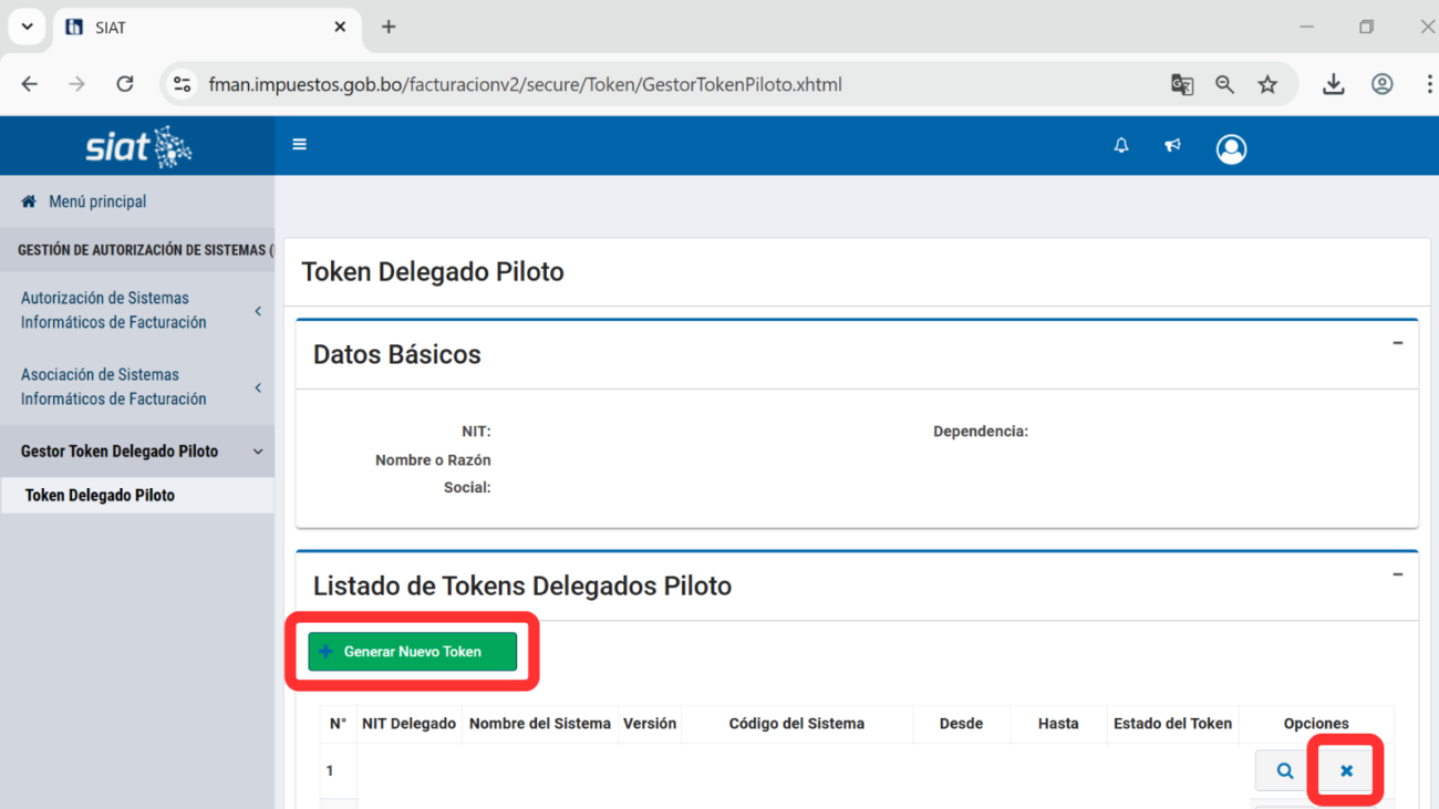 Si ya se cuenta con un token de prueba y se necesita reemplazarlo, lo eliminamos presionando la “x” antes de solicitar uno nuevo.