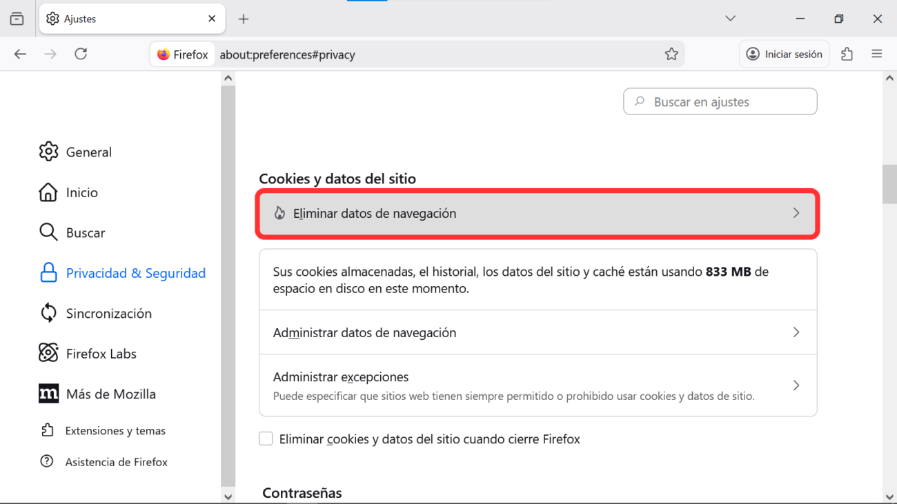 3) Nos dirigimos a “Cookies y datos del sitio“, y hacemos clic en “Eliminar datos de navegación“.