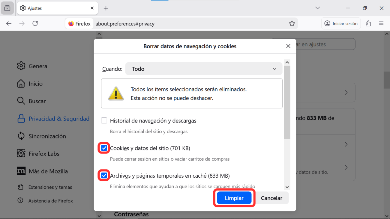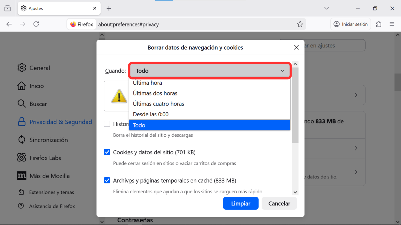 Pasos para eliminar o limpiar la memoria temporal en Firefox