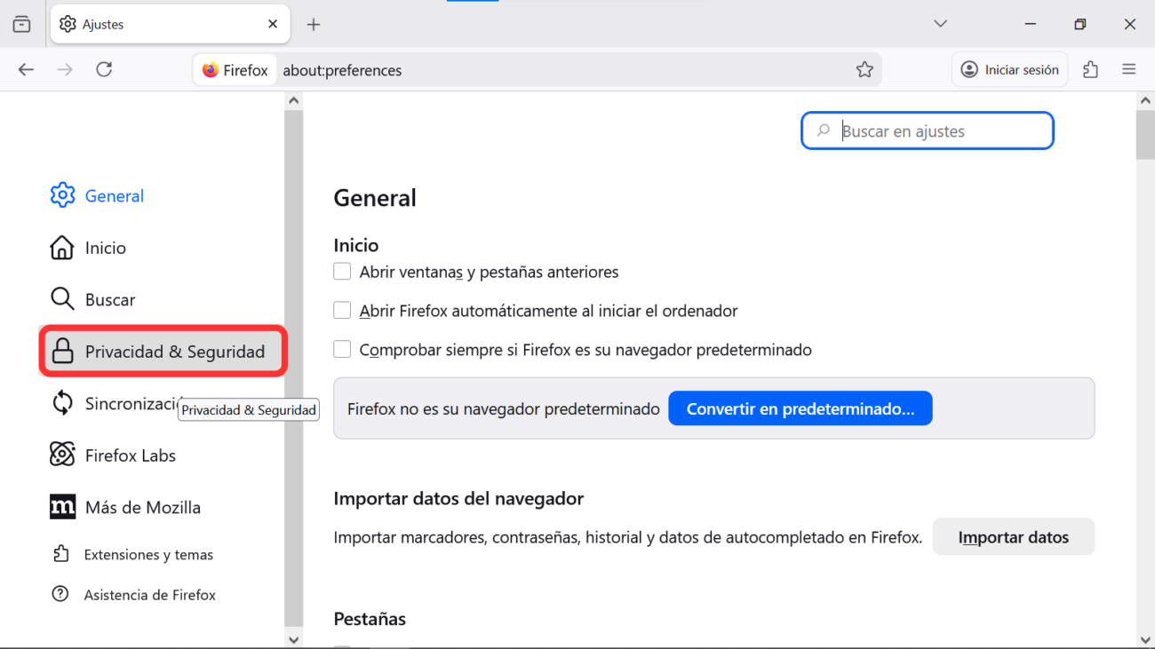 2) En el menú lateral izquierdo, hacemos clic en “Privacidad & Seguridad”.