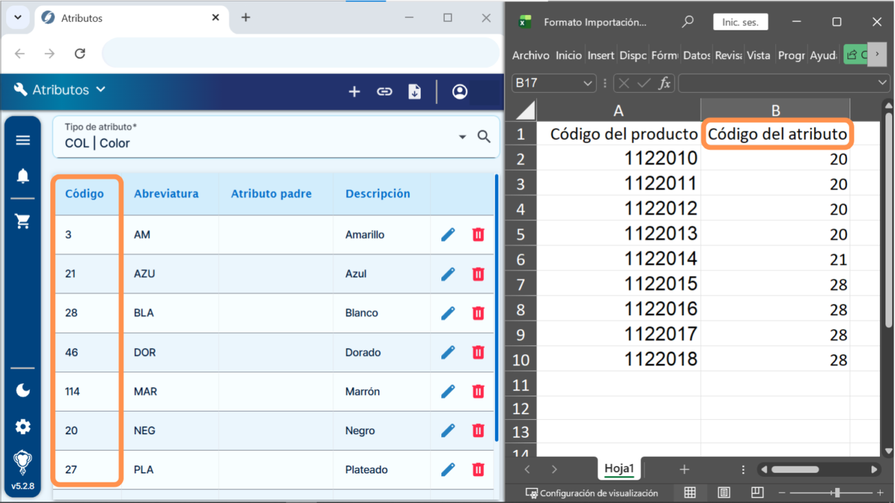 5) Preparamos el archivo con los códigos de los productos y atributos que deseamos relacionar.