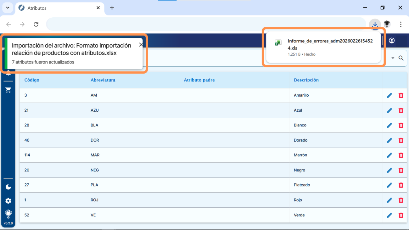 8) El sistema mostrará un mensaje de Importación del archivo y la cantidad de atributos actualizados.